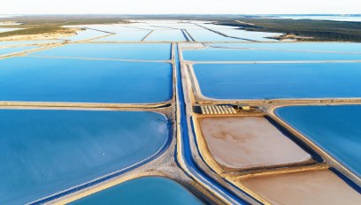 シャークベイ塩田は、シャーク湾の南端付近に位置しています。面積は約70平方キロメートルで、1960年代半ばに建設され、1967年より塩を出荷。水深の浅い天然の入り江を仕切るようにして建設された塩田には蒸発池や結晶池をはじめ、塩を洗浄するプラント、塩を貯蔵する貯塩場、専用の船積港などが設けられています。